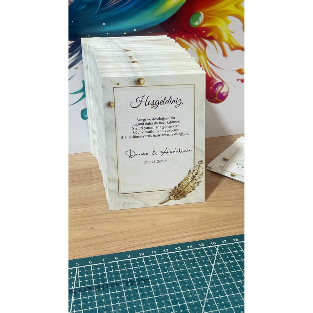 Kişiye özel tasarım .yazılmasını istediğiniz bilgileri soru cevap bölümünden sipariş numaranız ile bildirin. ; Digital baskı 350 gr kağıt Özel günlerinizde sizin yanınızdayız Yüksek kalite baskı Unutulmaz Anları Kalıcı Hale Getiren Hatıra Kartları Hayatımızın en özel anları olan söz, nişan, kına ve düğün gibi merasimler, unutulmak istenmeyen anılardır. ; Bu anların heyecanını ve mutluluğunu yıllarca saklamak için hatıra kartları en güzel seçeneklerden biridir. ; Hatıra kartları, sadece birer kağıt parçası değil, aynı zamanda o özel günün duygusal yükünü taşıyan özel objelerdir. ; Davetiyelerden menülere, fotoğraf kolajlarından konuk mesajlarına kadar birçok farklı tasarımda hazırlanabilen hatıra kartları, hem estetik bir görünüm sunar hem de unutulmaz anıları canlı tutar. ; Söz, Nişan ve Kına Hatıra Kartları Söz ve nişan gibi özel günlerde, çiftlerin isimleri ve özel tarihlerinin yer aldığı zarif tasarımlı hatıra kartları sıklıkla tercih edilir. ; Kına gecelerinde ise gelinin el ve ayaklarının kınasıyla süslenmiş, geleneksel motiflerle bezenmiş hatıra kartları oldukça popülerdir. ; Bu kartlar, hem misafirlere verilen özel bir hediye olur hem de yıllar sonra dönüp bakıldığında o günün heyecanını tekrar yaşamaya olanak tanır. ; Düğün Hatıra Kartları Düğün, hayatın en özel dönüm noktalarından biridir. ; Bu özel günde, çiftlerin isimlerinin yanı sıra düğün teması, mekan fotoğrafları ve çiftin hikayesini anlatan kısa bir mesajın yer aldığı hatıra kartları hazırlanabilir. ; Ayrıca, misafirlerin düğünle ilgili düşüncelerini ve dileklerini yazabilecekleri boş alanlar bırakılarak, kartlar aynı zamanda birer hatıra defteri işlevi görebilir. ; Hatıra Kartlarının Önemi Hatıra kartları, sadece estetik bir görünüm sunmakla kalmaz, aynı zamanda birçok fayda sağlar: Unutulmaz Anılar: Bu kartlar, özel günlerin unutulmaz anılarını canlı tutar. ; Hediyelik Eşya: Misafirlere verilen özel bir hediye olarak değerlendirilir. ; Dekorasyon: Evde veya ofiste sergilenerek şık bir dekorasyon unsuru olabilir. ; Koleksiyon: Farklı özel günlere ait hatıra kartları bir araya getirilerek anlamlı bir koleksiyon oluşturulabilir.;